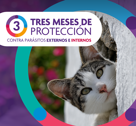 Es una solución que ha sido especialmente diseñada para gatos. Ofrece una protección sostenida contra pulgas, garrapatas y ácaros del oído con un plus de protección frente a parásitos internos por 3 meses.